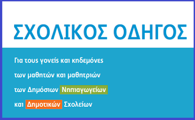 σας ενημερώνουμε ότι σήμερα Πέμπτη 14 Μαρτίου 2019 θα διανεμηθεί σε όλους/ες τους/τις μαθητές/τριες του σχολείου μας ο Σχολικός Οδηγός του Υπουργείου Παιδείας, ο οποίος απευθύνεται στους γονείς/ κηδεμόνες των μαθητών/τριών των Νηπιαγωγείων και Δημοτικών Σχολείων.